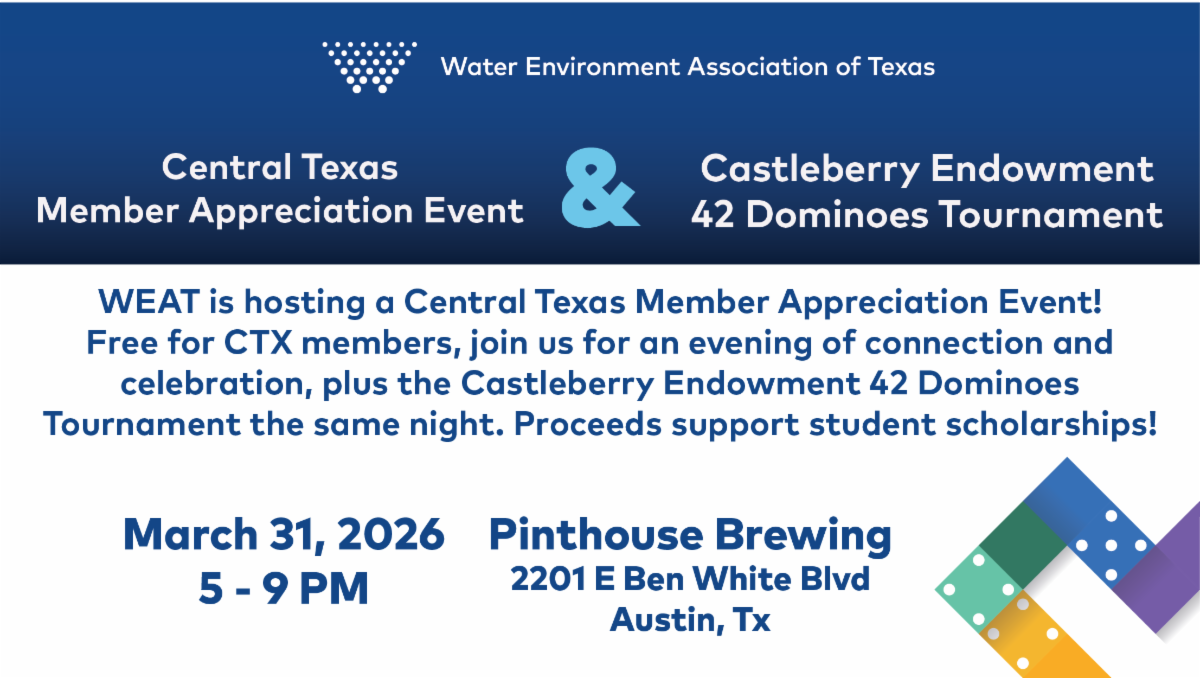 Cost for Students: $5 – includes dinner Click here to Prepay via Credit Card Date and Time: March 24, 2026, 11:30 AM – 1:00 PM Location: Austin Water-Center for Environmental Research, 2210 South FM 973, Austin, Texas 78725 Parking: Free parking is available Unfortunately, we are no longer able to offer free meeting attendance to Austin Water employees. Austin Water Employees will need to sign up and pay as a member/guest. |